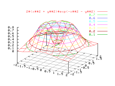 splot [-2:2] [-2:2] 2*(x**2 + y**2)*exp(-x**2 - y**2)