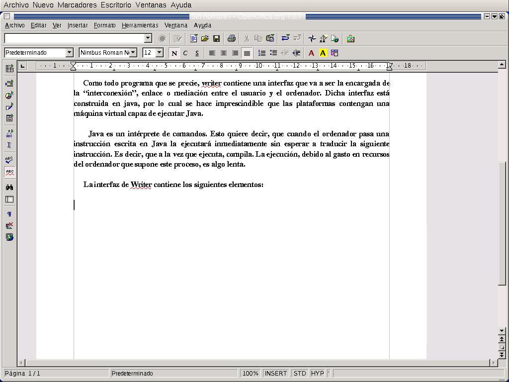 Cuando abrimos OpenOffice.org writer, sin dar ninguna opción desde la línea de comandos del Linux o desde la ventana de MS-DOS en Windows, lo primero que hace es abrirse con la zona de trabajo completamente vacía, como si fuéramos a editar un documento nuevo. En este caso podemos empezar a escribir un nuevo documento que podemos guardar si lo deseamos.