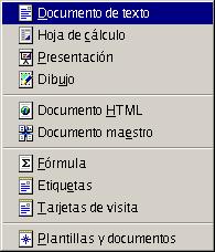 Ir a la barra de objetos, pulsar "nuevo", y nos abre un cuadro flotante de diálogo, en el que podemos seleccionar el tipo de documento nuevo que deseamos crear.