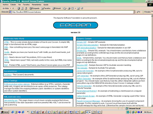 Cuando usted inicia Tomcat puede darse cuenta que el fichero es descomprimido automáticamente en el directorio CATALINA_HOME/webapps/cocoon/, el cual llamaremos de ahora en adelante COCOON_HOME. Para probar si cocoon está funcionando puede abrir la dirección http://localhost:8080/cocoon/ en el browser, en la cual debe mostrársele una página de bienvenida de este estilo.