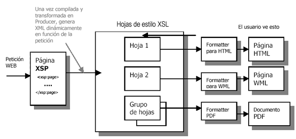 El XML procesado se le pasa al elemento que aplica el formato. Si el documento es un documento final,XML aplica el formato y le envía el documento formateado al cliente. En el caso que el documento XML procesado, sea código que deba ejecutarse (como en el caso de una XSP ya compilada), éste se pasa como productor de XML y se vuelve a procesar hasta que se llega a un documento XML final.