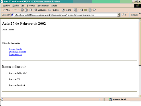 Por último inicie su servidor de Servlets y cargue el documento. Para el caso de Apache Tomcat puede cargar el documento en http://localhost:8080/cocoon/MiAplicacion/FormatoDeReunionSemanal.html.