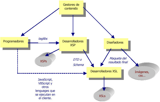 Como ya nos hemos podido dar cuenta el paralelismo con Cocoon se incrementa de forma enorme. Esto mejora tanto la calidad de los productos (ya que las personas se especializan en un área en particular) como los tiempos de desarrollo de trabajo y de respuesta de los mismos. Aquí se explica como se puede hacer Workflow con Cocoon. En éste se deben tener en cuenta estos 5 perfiles.