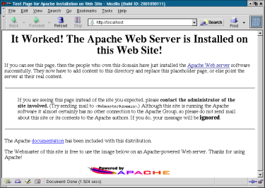 Una vez realizada la instalación, Apache queda listo para trabajar. Podemos comprobar que funciona tecleando en nuestro navegador favorito http://192.168.1.1 se nos mostrará entonces una pantalla de bienvenida del servidor (It worked!), síntoma de que hemos contactado con él y se encuentra funcionando.