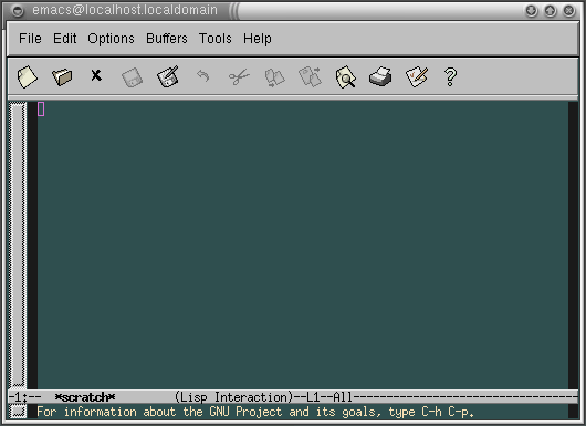 Para comenzar a escribir un documento necesitará abrir una sesión de emacs, para ello desde la línea de comandos del shell, ejecute emacs hola.sgml&, en mi computador esto luce de la siguiente forma: