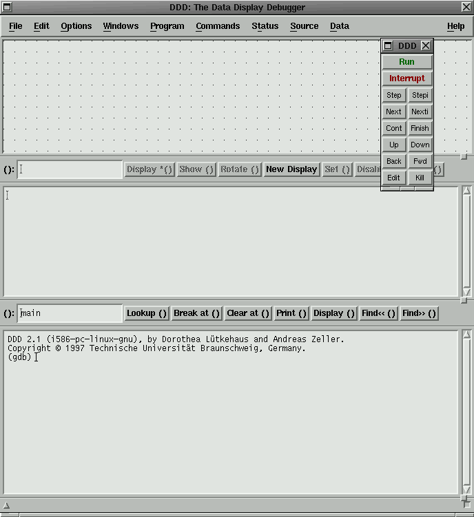 1. resim ana pencerenin 3 alt pencereye bölündüğünü gösteriyor. En alttaki alt pencere yalın debugger consoludur (bizim durumumuzda bu gdb'dir). Burada, eğer ddd arayüzümüz olmasaydı burada doğrudan gdb komutlarını kullanabilirdik. Ortadaki alt pencere ise programın kaynak kodunu göstermektedir, ve üst alt pencere ise programın değişkenleri ve nesneleri için grafik bir ortamdır. Son olarak ise, araç barı (toolbar) ddd komutlarının çalıştırılmasının kontrolünü sağlar.