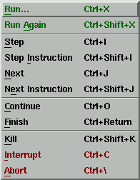 Programı çalıştırıp durdurabiliriz, menü barının kullanılması durumunda, dialog penceresini kullanarak programa bazı parametreler vermek olasıdır. Step komutu, programı satır satır çalıştırır, bu durumda, programın herhangi bir yerinde bir fonksiyon çağırılırsa, hata bulucu o fonksiyonun başına gidecek ve bir sonraki Step komutunu bekleyecektir. Öte yandan, Next komutu ise, fonksiyonları tek satır olarak kabul eder ve bu işlemleri tek aşamada yapar.
