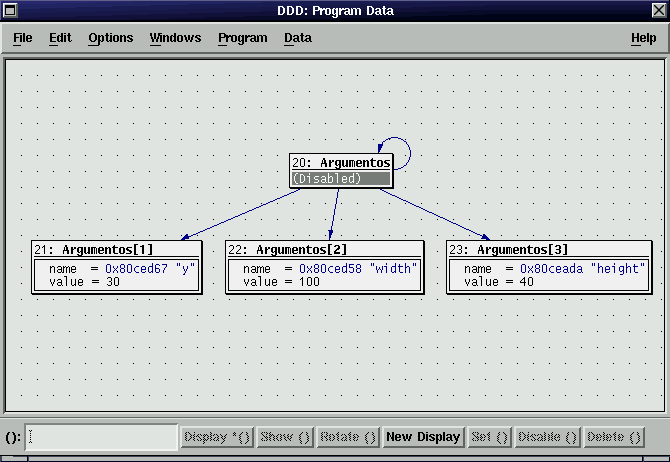 Muhtemelen, bu grafik ortamın en önemli özelliği, pencerenin üst tarafında bulunan bilgi gösteren penceredir. Grafiklerle, bilginin yapısını, içeriğini ve diğer bilgiler ile arasındaki bağlantıları buradan izleyebiliriz. Bir sonraki örnekte, bir dizi (argümanlar) ve o dizinin dört elemanı görülmektedir.
